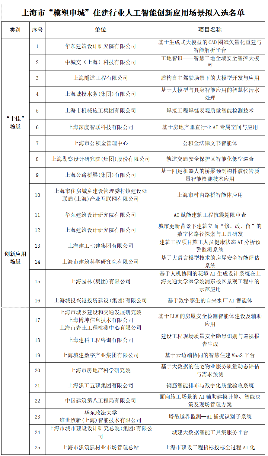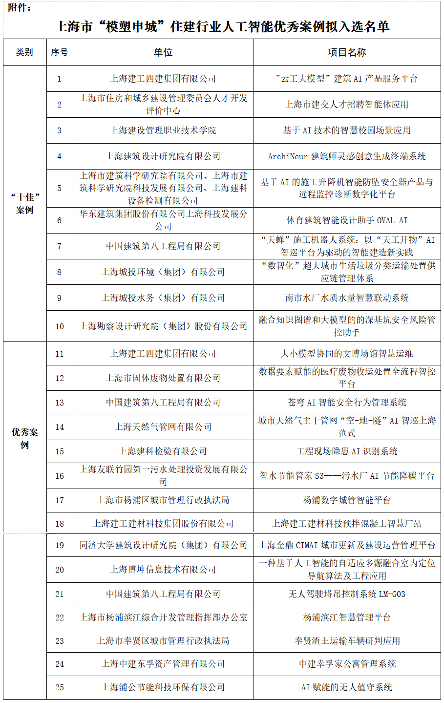 附件:上海市“模塑申城”住建行業人工智能優秀案例和創新應用場景擬入選名單